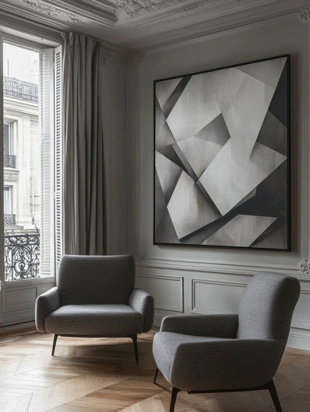 A modern canvas painting exploring layered geometric forms and tonal contrasts, creating depth, balance, and a bold contemporary aesthetic.